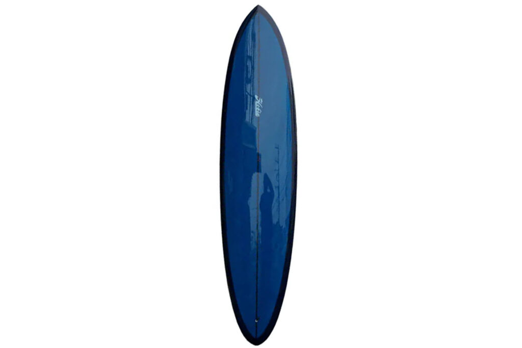ミッドレングスな長さと、抵抗を極力抑えた細めのノーズアウトラインが、大きめの波にテイクオフするのに必要なパドルスピードを得やすくしている。